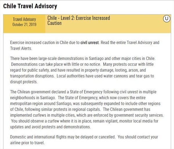 Fue el pasado 21 de octubre, cuando ya regía el estado de emergencia, que el Departamento de Estado de EE.UU. alertó a sus ciudadanos con un mensaje que decía que debían «ejercer un aumento de precaución» a la hora de viajar a Chile.