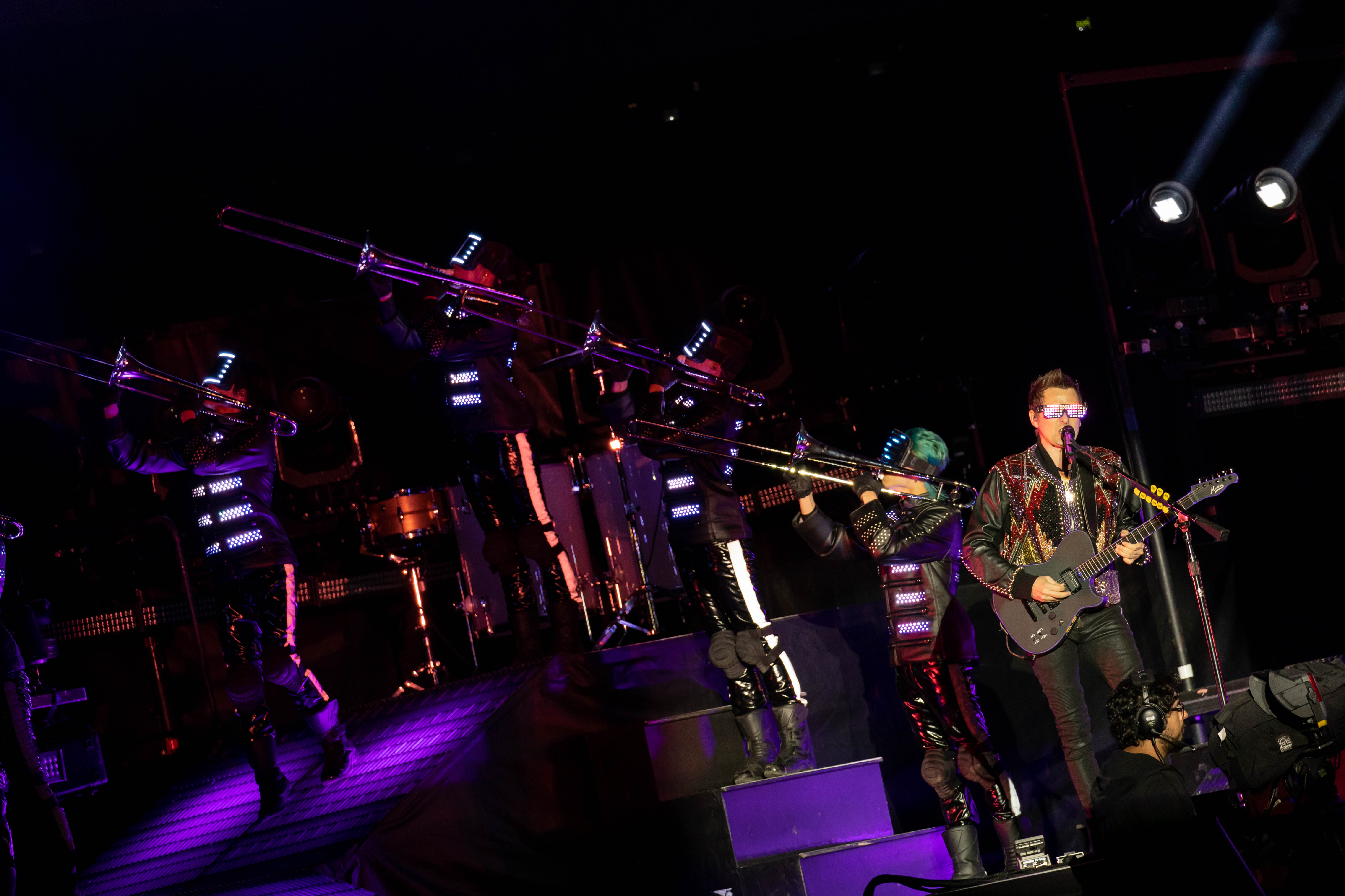 Pasadas las 21:10, luego de 40 minutos con música “espacial”. Entró a escena Muse junto a 10 bailarines tapados y vestidos con máscaras led y uniformes iluminados. Bellamy con sus clásicos lentes y Wolstenholme con su instrumento alumbrado, entregaron rápidamente “Algorithm” y “Pressure” mostrando el concepto principal del octavo trabajo de temática virtual y cinéfila.