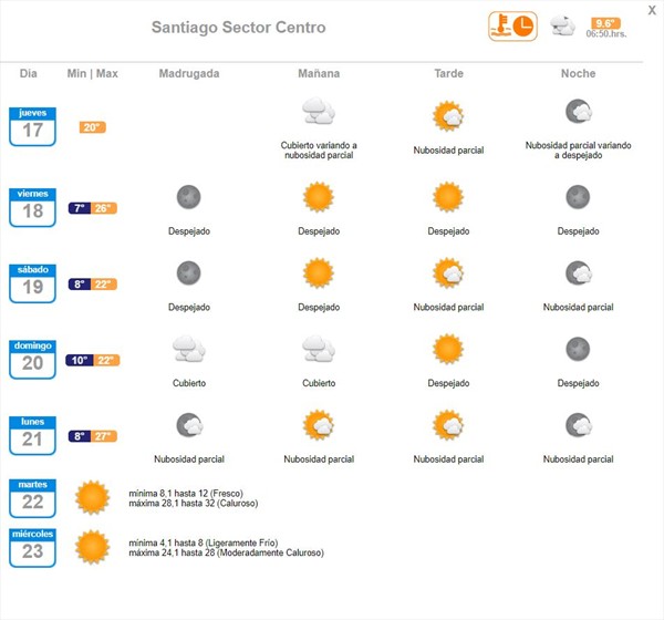 Noticias Revisa el tiempo para hoy en la Región Metropolitana Aún no sales y no sabes si abrigarte o no... en Futuro.cl tenemos la solución. Por Diego Puebla Hernández | 17 Oct, 2019. 10:00 hrs Aún no sales y no sabes si abrigarte o no… en Futuro.cl tenemos la solución. Con un día entre nubes y sol se sentirá este jueves 17 de octubre en la región Metropolitana, con una mínima de 9°C y una máxima de 20°C. Según informó la Dirección Meteorológica de Chile, para este viernes se espera nuevamente una mínima de 7 grados, pero una máxima un poco más calurosa, con 26 gradps y un día totalmente despejado. Para este sábado 19 de octubre se espera que los termómetros suban al comienzo del día marcando 8°C y 22°C en su peak. Finalmente, para este domingo habrá una mínima de 10 grados en una mañana cubierta, pero la máxima de temperatura llegará a los 22 grados. Cabe destacar que para esta próxima semana se esperan días un poco más calurosos. Puedes revisar aquí el pronóstico del tiempo para todas las ciudades de Chile. tiempo Este jueves 17 se celebra el día del churrasco en nuestro país Las inspiradoras palabras de Sadio Mané: ‘¿Para qué quiero diez Ferraris? Prefiero construir escuelas’ Sigue a FUTURO.cl en Google Discover Recibe nuestros contenidos directamente en tu feed. Seguir en Google Contenido patrocinado