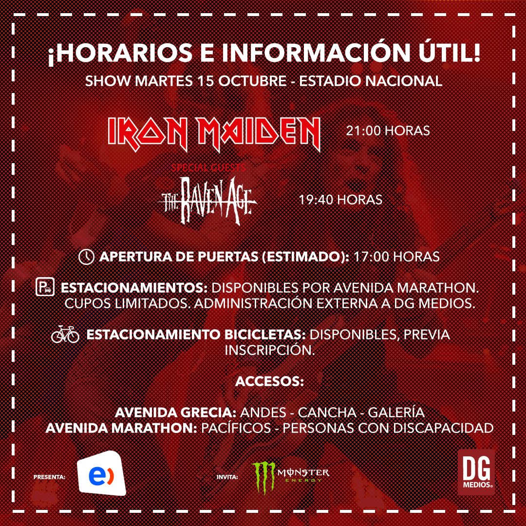 Las puertas del recinto se abren a las 17 hrs aproximadamente. The Raven Age, la banda que abrirá la jornada, tocará a las 19:40 hrs. Y finalmente, Iron Maiden arrancará su show en el Estadio Nacional a las 21. hrs.