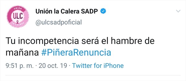 Noticias Unión La Calera publicó que Sebastián Piñera renuncie Luego el equipo cementero borró el tuit. Por Diego Puebla Hernández | 21 Oct, 2019. 10:57 hrs Luego el equipo cementero borró el tuit. Unión La Calera publicó un tweet apuntando directamente a la salida de Sebastián Piñera con el hashtag #RenunciaPiñera. Pese a que el club cementero borró la publicación, muchos usuarios lograron capturarlo mediante pantallazo. En el texto, el cuadro de la quinta región interior decía «Tu incompetencia será el hambre de mañana #FueraPiñera». Revisa aquí el tweet que fue eliminado La Calera Ska-P: "Ánimo y mucha fuerza Chilito" Mon Laferte emplaza a Piñera en video: "Esto se le salió de control" Sigue a FUTURO.cl en Google Discover Recibe nuestros contenidos directamente en tu feed. Seguir en Google Contenido patrocinado