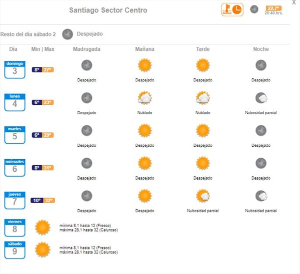 En Santiago este martes los termometros llegarán hasta los 29 grados, el miércoles a los 31 grados y el jueves a los 32 grados.