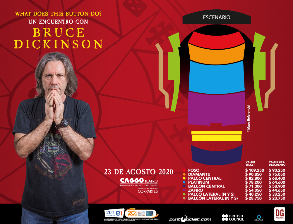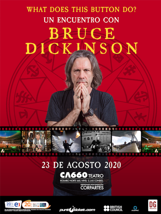 Un show especial se confirma para la temporada 2020: Bruce Dickinson, la voz de Iron Maiden llegará a Chile con un show conversatorio el 23 de agosto en el Teatro Corpartes. El motivo es la presentación en sociedad de su autobiografía «What does this button do?», un best-seller que suma a sus otros libros editados y a sus múltiples proyectos fuera de la música.