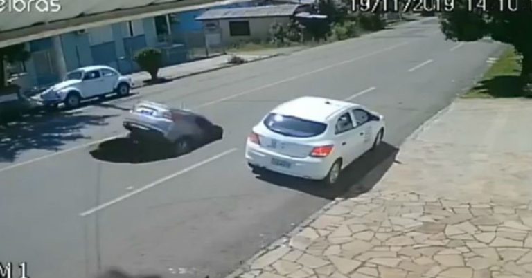 Es que las cámaras de seguridad captaron el momento exacto en que un socavón se abrió en plena calle de la ciudad Flores da Cunha, en Brasil, luego del paso de un camión.