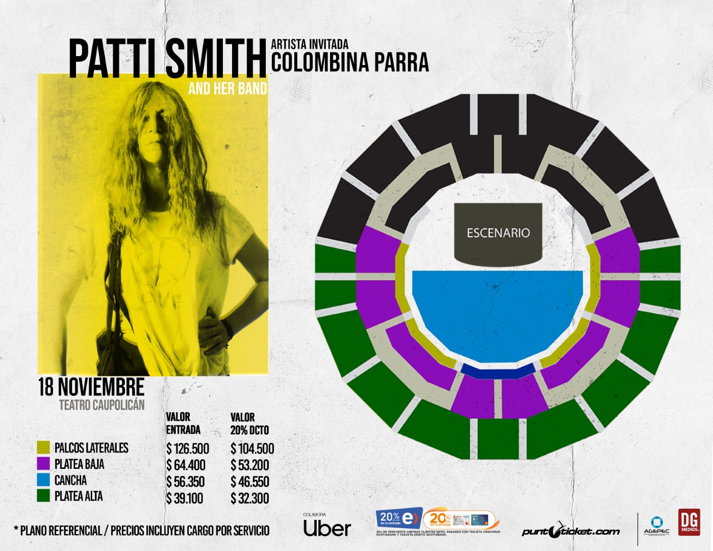 Patti Smith se presentará por primera vez en nuestro país el próximo lunes 18 de noviembre en el Teatro Caupolicán, y Colombina Parra, junto a su hermano, el también músico Juan de Dios Parra, y el baterista Aldo Benincasa de The Ganjas, serán los encargados de abrir el tan esperado show de la sacerdotisa del punk.