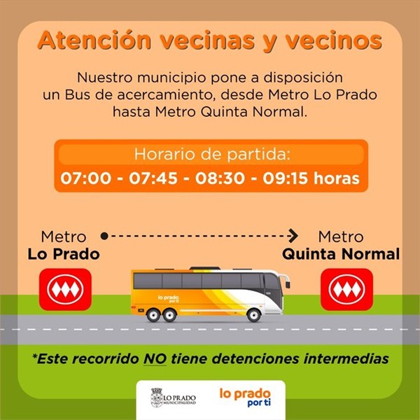 Noticias Estación Lo Prado no volverá a abrir durante el 2019 El municipio tendrá un bus de acercamiento a la estación Quinta Normal. Por Diego Puebla Hernández | 05 Nov, 2019. 12:45 hrs El municipio tendrá un bus de acercamiento a la estación Quinta Normal. La Municipalidad de Lo Prado anunció que, según le informó el gerente general de Metro, Rubén Alvarado, la estación Lo Prado no se volverá a funcionar durante este 2019. Debido a esto, la comuna dispuso de un bus municipal de acercamiento desde la estación Lo Prado hasta Quinta Normal en la Línea 5. El bus tendrá los siguientes horarios de salida desde la estación Metro Lo Prado: a las 07:00; 07:45; 08:30 y 09:15 horas, sin paradas intermedias y con un cupo para 45 pasajeros. lo prado Felipe Harboe y Piñera en marchas: "Es bastante sorprendente su respuesta" Dragon Ball Z: Gokú y Ten Shin Han lucen prácticamente idénticos Sigue a FUTURO.cl en Google Discover Recibe nuestros contenidos directamente en tu feed. Seguir en Google Contenido patrocinado