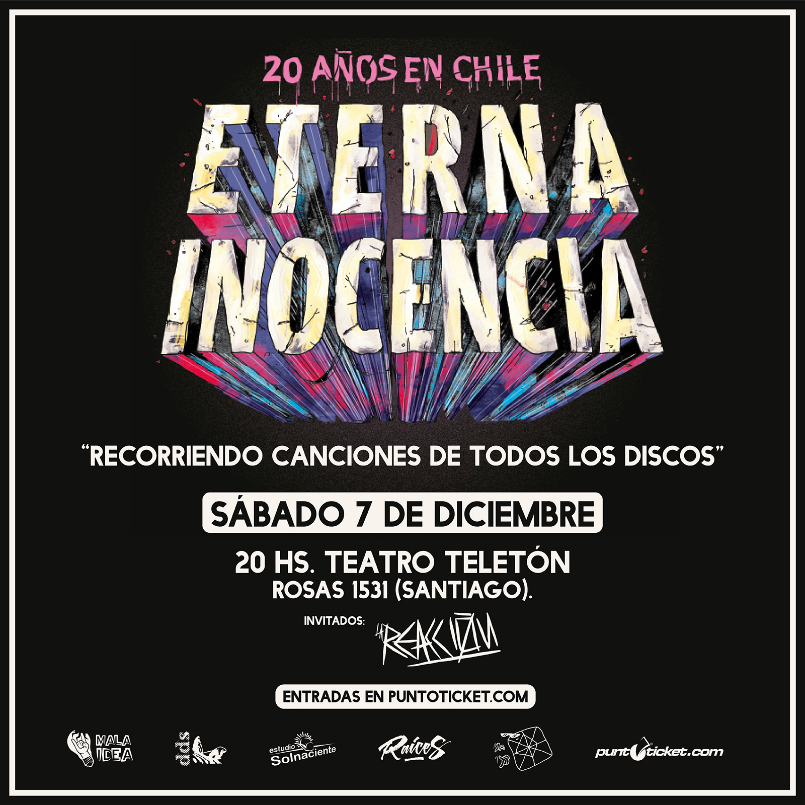 Eterna Inocencia vuelve a Santiago de Chile, para celebrar los 20 años desde su primer desembarco en tierras chilenas. El show será un repaso de toda la discografía de la banda, incluyendo canciones que no han sido tocadas en años. Como invitados y encargados de abris el show, se presentará la banda local La Reacción. La cita es el Sábado 7 de Diciembre desde las 20:00 horas en el Teatro Teletón, Rosas 1531, Santiago de Chile.