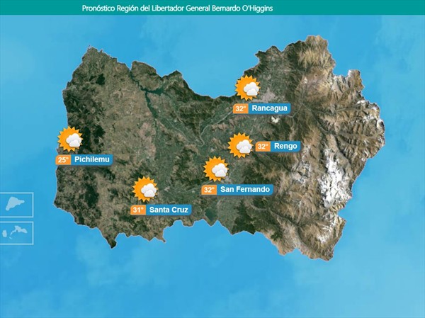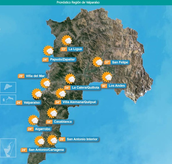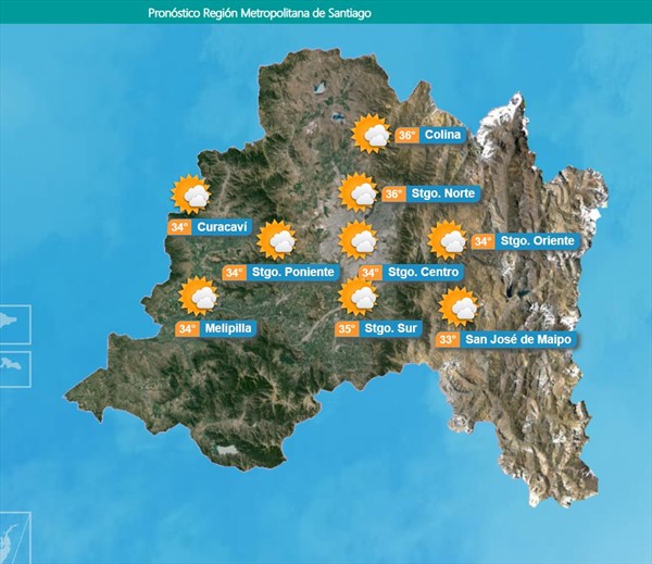 Noticias Hasta 37 grados se esperan en la zona central de nuestro país La "ola de calor" afectará desde este lunes 18 de noviembre hasta este miércoles 20. Por Diego Puebla Hernández | 18 Nov, 2019. 13:33 hrs La «ola de calor» afectará desde este lunes 18 de noviembre hasta este miércoles 20. La Dirección Meteorológica de Chile dio un aviso de un evento de altas temperaturas que afectará desde este lunes 18 de noviembre hasta el miércoles 20 a las regiones de Coquimbo, Valparaíso, Metropolitana, O’Higgins, Maule, Ñuble y Biobío. En San Felipe, en la región de Valparaíso, llegarán a los 37°C hoy, mientras que en la zona norte de Santiago se esperan hasta 36°C. Revisa aquí el pronóstico para este lunes en todas las regiones: Región de Coquimbo Región de Valparaíso Región Metropolitana Región de O’Higgins Región del Maule Región del Ñuble Región del Biobío zona central Mira las imágenes de Baby Yoda que generaron ternura en redes sociales Nuclear Blast anuncia descuento para el concierto de Accept Sigue a FUTURO.cl en Google Discover Recibe nuestros contenidos directamente en tu feed. Seguir en Google Contenido patrocinado
