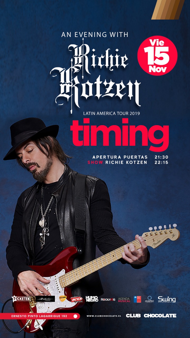 Noticias Horarios para el concierto de Richie Kotzen en Santiago El cantante y guitarrista se presenta este viernes 15 de noviembre en el Club Chocolate. Por Jorge Lagas | 13 Nov, 2019. 13:41 hrs Este viernes 15 de noviembre es el concierto de Richie Kotzen en Santiago. La producción reafirmó la realización del show del cantante y guitarrista estadounidense, que va a ser en el Club Chocolate del barrio Bellavista, y tenemos los horarios: a las 21:30 hrs se abren las puertas y a las 22:15 empieza el concierto. Últimas entradas en Ticketek. Richie Kotzen Mira como leer la Constitución gratis y en Internet Selección Chilena decide no jugar amistoso contra Perú Sigue a FUTURO.cl en Google Discover Recibe nuestros contenidos directamente en tu feed. Seguir en Google Contenido patrocinado