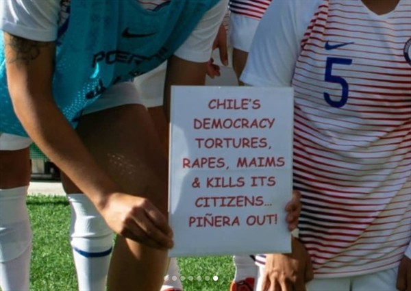 «La democracia de Chile, tortura, viola, mutila y mata a sus ciudadanos» era parte del mensaje mostrado por las jugadoras.