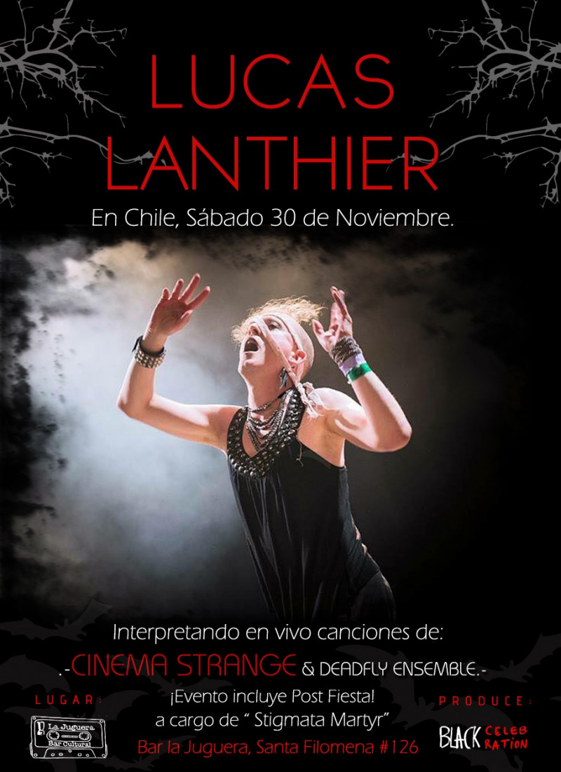 Noticias Lucas Lanthier, la voz de Cinema Strange, se presenta en Chile – Sábado 30 de noviembre, La Juguera El líder de una de las bandas emblemáticas del rock gótico trae lo mejor de su carrera. Por Jorge Lagas | 07 Nov, 2019. 14:53 hrs Lucas Lanthier, vocalista y guitarrista de Cinema Strange, banda emblemática del deathrock, goth y batcave de las últimas décadas, estará presentándose el sábado 30 de noviembre en La Juguera del barrio Bellavista, calle Santa Filomena #126. Estará tocando lo mejor de Cinema Strange, Deadfly Ensemble y su carrera solista. También hay post fiesta Stigmata Martyr. Entradas: en Passline y sin cargo en tiendas Indie Records (Eurocentro) y Kali Yuga (Galería Interprovidencia). Preventa 2 $15.000 Meet & Greet $20.000 Más información en el evento en Facebook. lucas lanthier Colectivo Criminales reúne músicos del metal chileno y lanza video de "Por la fuerza de la razón" Mira la nueva camiseta de la Universidad de Chile Sigue a FUTURO.cl en Google Discover Recibe nuestros contenidos directamente en tu feed. Seguir en Google Contenido patrocinado