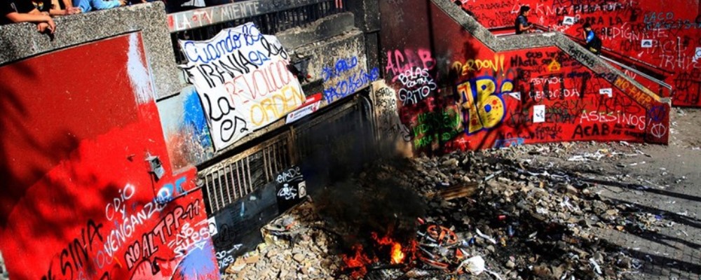 Rayados, destrozos y oscuridad total acompañan al recinto que se ha visto atacado una y otra vez por los actos de violencia que provocan carabineros y su represión a los manifestantes que se concentran en la Plaza Italia.