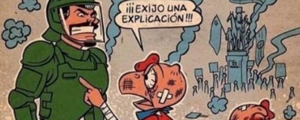 La imagen es completada con un fondo que muestra a manifestantes en la Plaza Baquedano, ahora también conocida como Plaza de la Dignidad, y un cuadro de diálogo en el que Condorito dice: «Exijo una explicación».