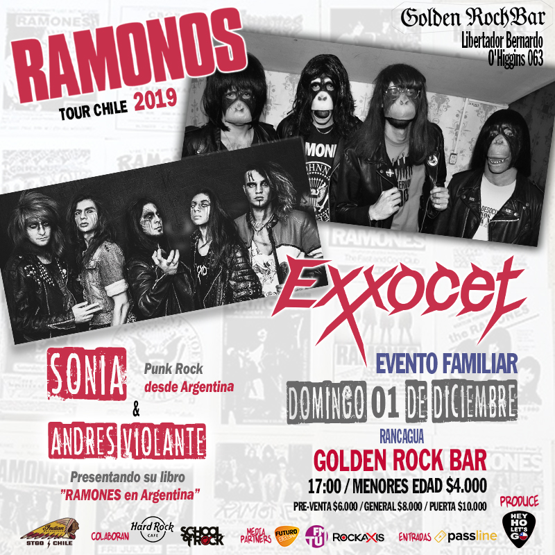 La primera parada es el Ramones Day, el viernes 29 de noviembre en el Hard Rock Cafe de Santiago, desde las 16 hrs, con entrada liberada. Ahí también se lanzará el libro “Ramones en Argentina”. Ese mismo día en la noche tocan en el Club Rock & Guitarras junto a Exxocet.
