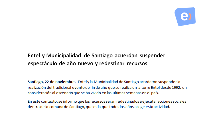 Noticias Se cancela espectáculo de Año Nuevo en la Torre Entel El tradicional festejo de fuegos artificiales se venía realizando de forma ininterrumpida desde 1992. Por Hector Muñoz Tapia | 22 Nov, 2019. 17:32 hrs El tradicional festejo de fuegos artificiales se venía realizando de forma ininterrumpida desde 1992. Ya han sido varias las comunas de Chile que han decidido suspender sus fiestas de Año Nuevo y shows pirotécnicos para recibir el 2020, destinando los recursos de esas celebraciones para beneficiar a los vecinos más vulnerables. Ahora, la empresa de telecomunicaciones Entel y la Municipalidad de Santiago anunciaron esta jornada que decidieron suspender el tradicional evento de fin de año que se realiza en la Torre Entel que se había realizado por 27 años de manera ininterrumpida, desde 1992. Según el comunicado, esta decisión es «en consideración al escenario que se ha vivido en las últimas semanas en el país. Los recursos serán redestinados a ejecutar acciones sociales dentro de la comuna de Santiago, que es la que todos los años acoge esta actividad». Torre Entel Donald Trump: ‘Quiero que me hagan un juicio político en el Senado’ Jorge González en Los Tenores: "Tengan un poco de paciencia. Hay peleas más grandes que un partido" Sigue a FUTURO.cl en Google Discover Recibe nuestros contenidos directamente en tu feed. Seguir en Google Contenido patrocinado