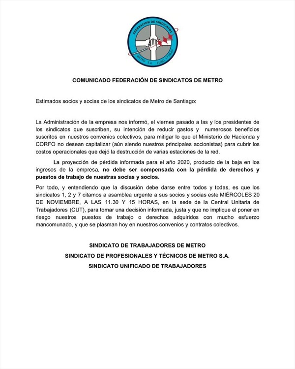 A través de un comunicado, informaron que el pasado viernes los presidentes de los sindicatos recibieron la decisión de Metro de «reducir gastos y numerosos beneficios suscritos en nuestros convenios colectivos, para mitigar lo que el Ministerio de Hacienda y Corfo no desean capitalizar (aún siendo nuestros principales accionistas), para cubrir los costos operacionales que dejó la destrucción de varias estaciones de la red».