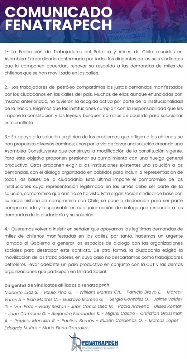 En un comunicado emitido por la Federación de Trabajadores de Petróleo y Afines de Chile sostuvieron que se ponen «a disposición para ser parte comprometida y responsable en cualquier opción de diálogo que responda a las demandas de la ciudadanía y su solución».