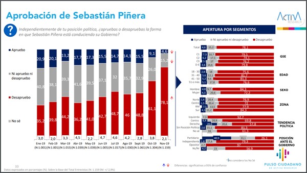 Esta mañana se publicó la encuesta Pulso Ciudadano de Activa Research del mes de noviembre. Y según los resultados, el Presidente Sebastián Piñera aumentó su desaprobación en 17 puntos, alcanzando el 78,1%. En tanto, el respaldo al Mandatario disminuyó del 9,1% en octubre a 4,6% el mes pasado.