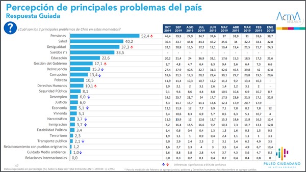 Respecto al estallido social, los encuestados por Activa Research afirman que las pensiones (52,4%), la salud (40,2%) y la desigualdad (37,3%) son los principales problemas de Chile en estos momentos. A esto se suman los sueldos (33,5%), criterio que se sumó al listado durante el mes de noviembre.