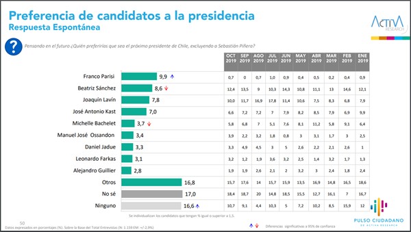 La reaparición de Franco Parisi también se reflejó en la encuesta de noviembre realizada por Activa Research. Tras ser ingresado a la última consulta, el economista lidera las preferencias presidenciales con un 9,9%. En tanto, Beatriz Sánchez bajó del 12,4% en octubre al 8,6% en noviembre, ocupando el segundo lugar. En tanto, el alcalde de Las Condes, Joaquín Lavín, ostenta el tercer lugar (7,8%). Mientras, el líder de Acción Republicana, José Antonio Kast, figura cuarto con un 7%.