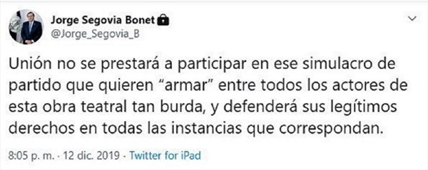 Noticias Dueño de Unión Española aseguró que no se presentarán en la definición del «Chile 4» El cuadro hispano y Universidad de Chile tienen que disputar en cancha el cupo por Copa Libertadores. Por Diego Puebla Hernández | 13 Dic, 2019. 11:10 hrs El cuadro hispano y Universidad de Chile tienen que disputar en cancha el cupo por Copa Libertadores. El máximo accionista de Unión Española, el español Jorge Segovia, aseguró que su equipo no se presentará a jugar en las semifinales de la Copa Chile 2019 ante Universidad de Chile, llave que entrega el cuarto cupo a la Libertadores 2020. El empresario que controla a los hispanos aseguró que no disputarán «en ese simulacro de partido que quieren ‘armar’ entre todos los actores de esta obra teatral tan burda», agregando que recurrirán a los tribunales deportivos para defender a los rojos. El gerente general de Unión Española, Luis Baquedano, confirmó en diálogo con los Tenores de la Tarde que asumirán el pago de la multa que pueden recibir de la ANFP por no presentarse y que defenderán su opción en instancias administrativas. Unión Española Expulsan a 56 ciudadanos extranjeros por diversos delitos luego del 18 de octubre Brad Pitt reveló nuevo capítulo de su vida: Fue adicto al alcohol y a la marihuana Sigue a FUTURO.cl en Google Discover Recibe nuestros contenidos directamente en tu feed. Seguir en Google Contenido patrocinado