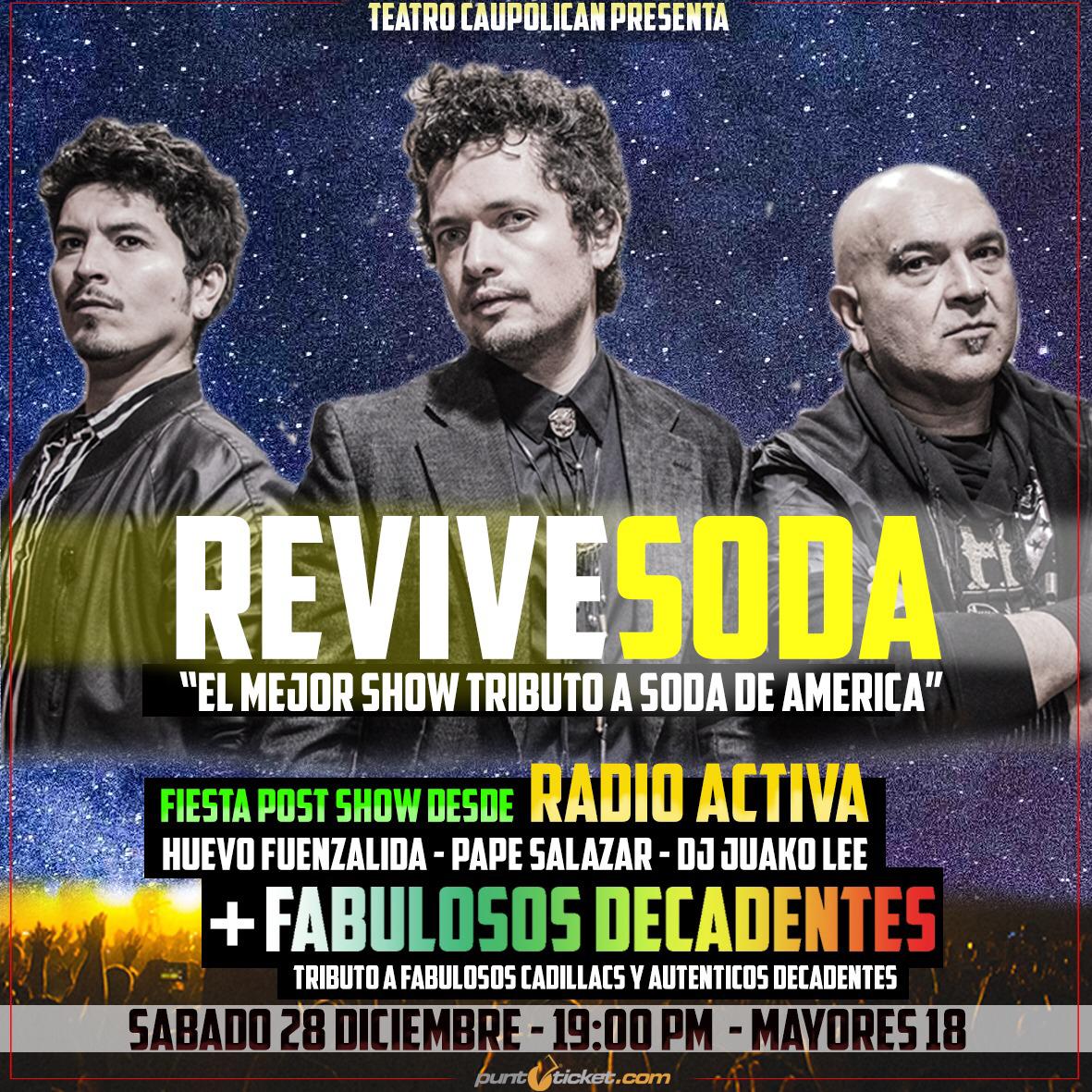 ¡Que gran manera de terminar el año! Revive Soda, el mejor tributo a Soda Stereo de América Latina, llega nuevamente al Teatro Caupolicán para cerrar un 2019 lleno de éxitos. El show está programado para el próximo 28 de diciembre en el recinto de San Diego, donde la banda repasará los grandes hitos del conjunto trasandino, revisando el legado cosechado por Cerati, Bosio y Alberti.