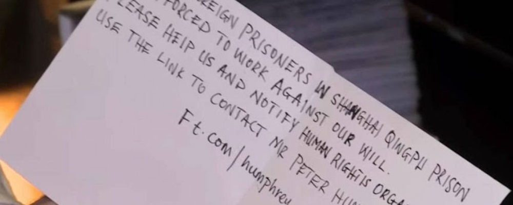 El mensaje, escrito en inglés, explicaba que se trataba de un prisionero extranjero que se veía obligado a trabajar en la cárcel china de Qingpu. Además, pedía que se denunciara la situación a las organizaciones de derechos humanos y se contactara con Peter Humphrey, un periodista británico que estuvo encarcelado en esa misma prisión, para hacerle llegar la denuncia.