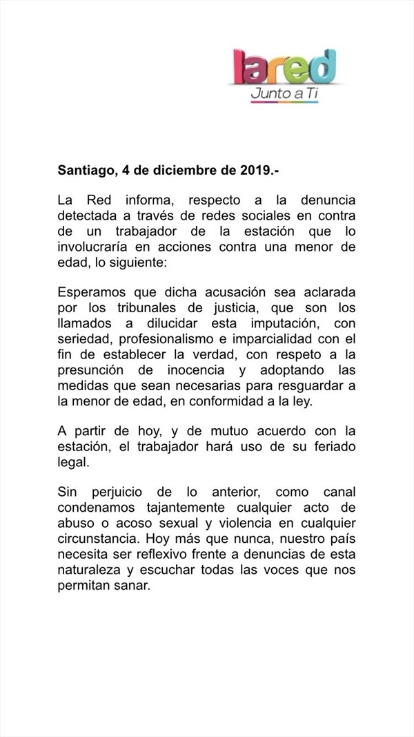 Ante la denuncia, La Red sostuvo que «esperamos que dicha acusación sea aclarada por los tribunales de justicia, que son los llamados a dilucidar esta imputación, con seriedad, profesionalismo e imparcialidad con el fin de establecer la verdad, con respeto a la presunción de inocencia y adoptando las medidas que sean necesarias para resguardar a la menor de edad, en conformidad a la ley».