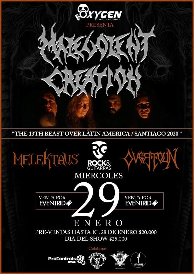 Noticias Malevolent Creation confirma concierto en Santiago – Miércoles 29 de enero, Club Rock & Guitarras Traen su último disco "The 13th beast" y lo mejor de su historia. Por Jorge Lagas | 04 Dic, 2019. 14:29 hrs Malevolent Creation vuelve a Chile, la banda estadounidense de death metal va a tener una presentación en Santiago el miércoles 29 de enero en el Club Rock & Guitarras, como parte de la gira que promueve su último disco “The 13th Beast” y lo mejor de su historia. Invitados: los nacionales Melektaus y Overtoun. Entradas: Eventrid.cl, preventa $20.000, día del show $25.000. Se espera también que haya otras fechas en otras ciudades de Chile, pronto estarán los detalles. malevolent creation RESEÑA // Accept en Chile: una maquinaria que se renueva Scorpions prepara nuevo disco con productor de Metallica y Slipknot Sigue a FUTURO.cl en Google Discover Recibe nuestros contenidos directamente en tu feed. Seguir en Google Contenido patrocinado