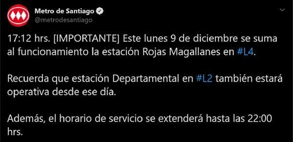 Así lo comunicó el Metro de Santiago en sus redes sociales, donde además adelantaron que otra estación de la L2 también estará disponible desde ese mismo día: «este lunes 9 de diciembre se suma al funcionamiento la estación Rojas Magallanes en L4. Recuerda que estación Departamental en L2 también estará operativa desde ese día».