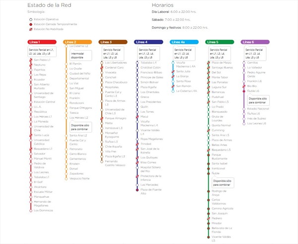 Por su parte, en las estaciones Irarrázaval, Ñuble y Vicente Valdés no están operando las combinaciones a las líneas 3, 6 y 4, respectivamente.