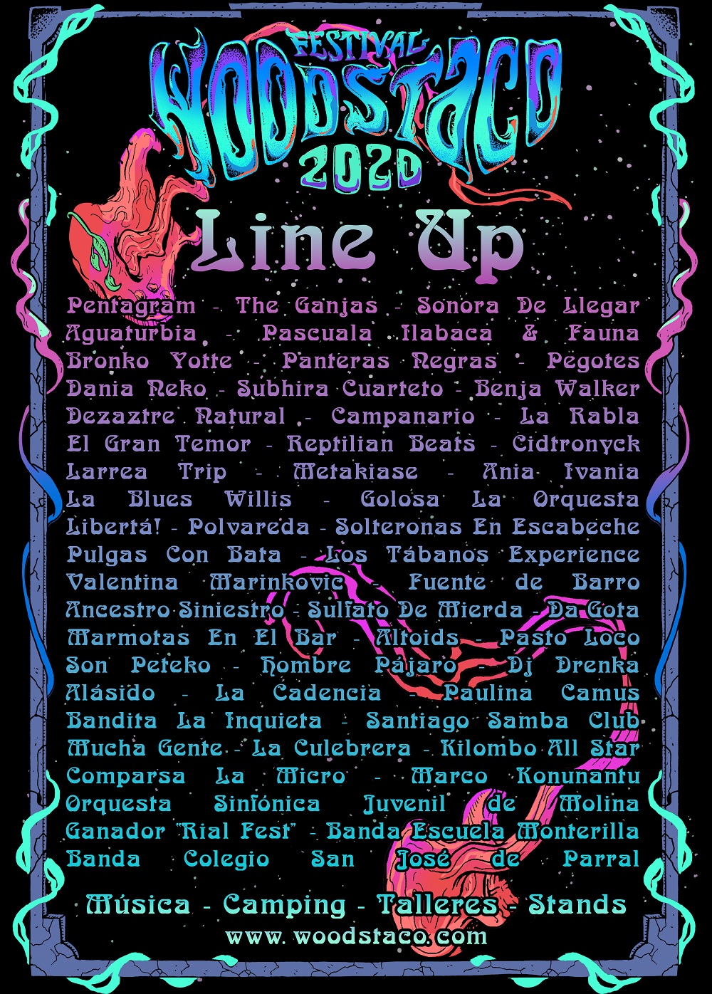 Noticias Pentagram y The Ganjas encabezan cartel definitivo del festival Woodstaco 2020 Más de 100 artistas en tres días marcarán la nueva edición del encuentro. Por Jorge Lagas | 05 Dic, 2019. 14:16 hrs El festival Woodstaco, que se ha hecho tradicional cada verano en nuestro país, ya tiene cartel definitivo para su edición 2020, que es el 28 y 29 de febrero y el 1 de marzo. Como siempre, pura música nacional con más de 100 artistas, en tres días de música y naturaleza en el Camping Trapiche San Manuel, en Parral. Hay harto rock, pero también exponentes de todos los estilos. Confirmados dentro de los cabezas de cartel: Pentagram, The Ganjas, Aguaturbia, Sonora de Llegar, Panteras Negras y muchos más. Entradas: Eventrid.cl, el cartel completo lo pueden revisar a continuación: Woodstaco Fiesta de Navidad de la empresa es la más esperada por los trabajadores para ser infiel Contraloría: El himno de los Carabineros solo puede ser ejecutado en ceremonias y actos oficiales Sigue a FUTURO.cl en Google Discover Recibe nuestros contenidos directamente en tu feed. Seguir en Google Contenido patrocinado