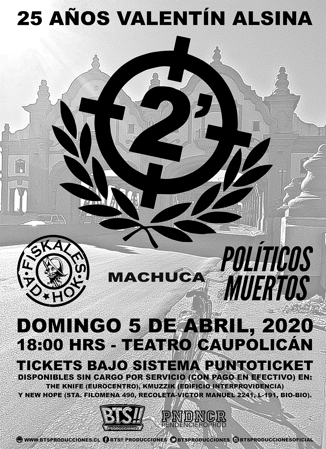 Noticias 2 Minutos regresa a Chile celebrando 25 años de «Valentín Alsina» – Domingo 5 de abril, Teatro Caupolicán Estarán repasando su histórico disco debut junto a destacadas bandas nacionales. Por Jorge Lagas | 16 Ene, 2020. 15:57 hrs El grupo punk argentino 2 Minutos vuelve a Chile, nada menos que celebrando 25 años de su recordado disco debut “Valentín Alsina”, símbolo de toda una época. Invitados: Fiskales Ad Hok, Machuca y Políticos Muertos. Entradas: Puntoticket, desde este viernes 17 de enero al mediodía. Primera Preventa a $15.000, stock limitado. Segunda Preventa $18.000, hasta el 4 de abril. Día de show $20.000. Sin cargo en The Knife (Eurocentro), Kmuzzik (galería Interprovidencia) y New Hope (barrio Patronato y persa Bío-Bío). 2 Minutos Periodista se burló de cicatriz de Joaquin Phoenix y usuarios de redes sociales se indignaron Nervosa tiene nueva fecha para su concierto en Chile - Sábado 6 de junio, Club Subterráneo Sigue a FUTURO.cl en Google Discover Recibe nuestros contenidos directamente en tu feed. Seguir en Google Contenido patrocinado