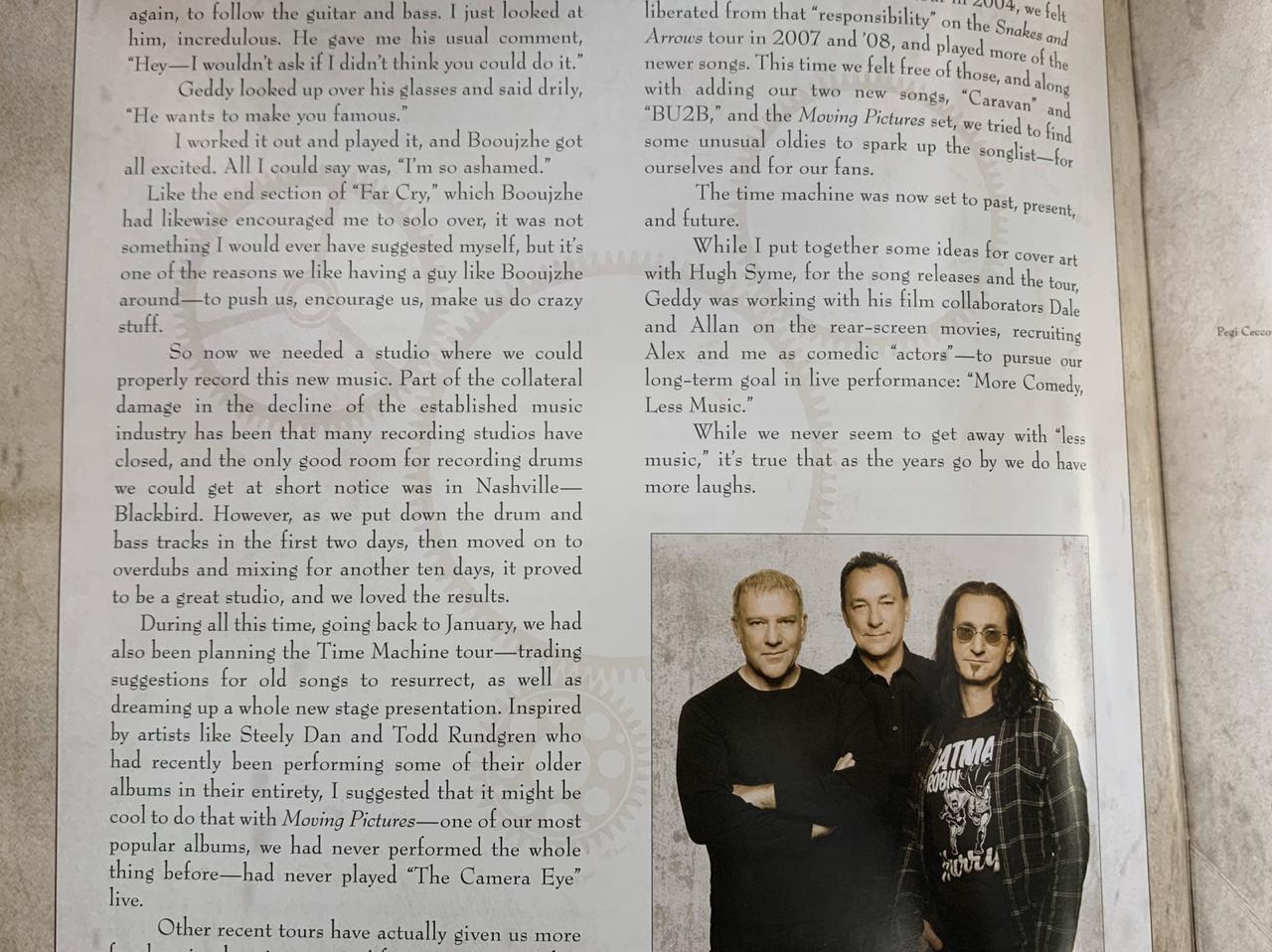 Durante todo este tiempo, desde enero, también hemos estado planeando la gira Time Machine: intercambiando sugerencias de canciones viejas para resucitar, y también soñando una presentación de escenario completamente nueva. Inspirado por artistas como Steely Dan y Todd Rundgren, que recientemente han tocado sus álbumes antiguos enteros, sugerí que podríamos hacer eso con Moving Pictures, uno de nuestros discos más populares. Nunca lo hemos tocado entero antes, y nunca hemos tocado “The Camera Eye” en vivo.