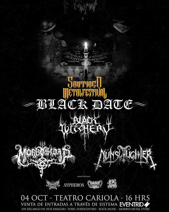 Se confirmó la realización de una nueva fecha del Santiago Metal Festival, con tres exponentes del lado más extremo: Black Witchery, Morbosidad y Nunslaughter llegan a Chile con una única fecha hasta ahora: domingo 4 de octubre, Teatro Cariola. Hay bandas nacionales invitadas como Invocation Spells, Aypheros y Violent Jaws.