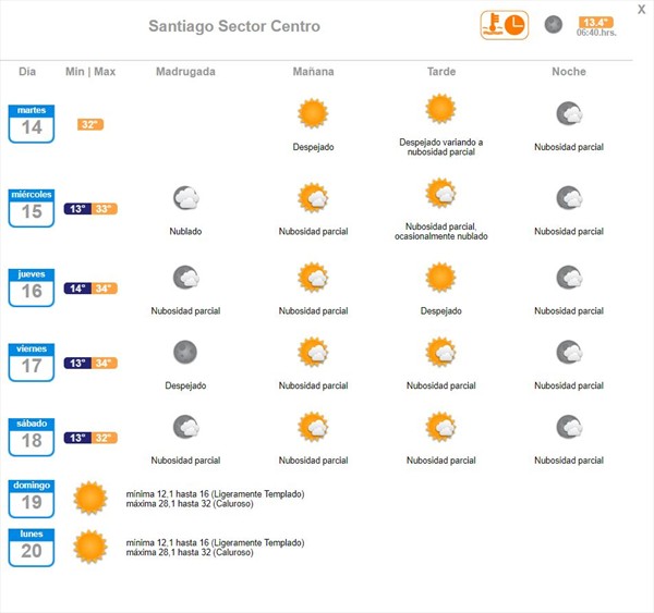 Según informó la Dirección Meteorológica de Chile, para este miércoles la mínima será de 13 grados, con 33 grados de tope, con un día con nubosidad parcial.