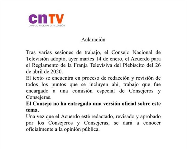 El pasado martes 14 de enero se informó en diversos medios que el Consejo Nacional de Televisión, CNTV, había rechazado la opción de franja de 30 minutos para organizaciones civiles, lo que fue desmentido.