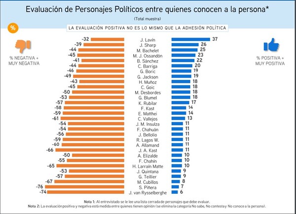 Entre los peores evaluados, están la senadora UDI Jacqueline Van Rysselberghe (6% a favor; 74% en contra), Sebastián Piñera (7% y 76%) y la ministra de Educación, Marcela Cubillos (8% y 67%).