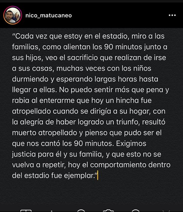 A través de sus redes sociales, Nicolás Maturana publicó una fotografía donde lamenta la muerte de Jorge Mora, exigiendo justicia por él y su familia. «No puedo sentir más que pena y rabia al enterarme que un hincha fue atropellado cuando se dirigía al hogar, con la alegría del triunfo. Resultó muerto y pienso que quizás estuvo cantando los 90 minutos. Exigimos justicia para él y su familia, que esto no puede volver a ocurrir».