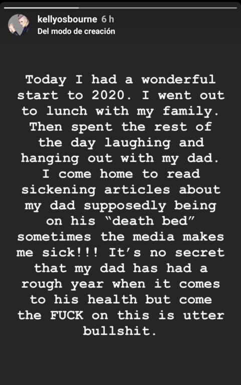 Un agitado comienzo de año tuvo el mundo musical luego de los rumores que apuntaban que Ozzy Osbourne se encontraba en su «lecho de muerte». Y es que un medio encendió todas las alarmas al afirmar que el vocalista de Black Sabbath estaba sufriendo dolores crónicos que no le permitían ni siquiera reconocer a su esposa. Una de las personas que decidió hablar para referirse a todas las reacciones que esto generó fue Kelly Osbourne, quien dijo que todo es una mentira.