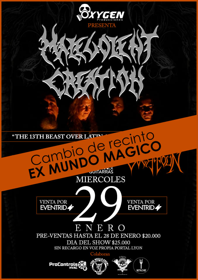 Hay nuevas coordenadas para la presentación en Santiago de la banda estadounidense de death metal Malevolent Creation, que vienen presentando su más reciente disco «The 13th beast» de 2019. Originalmente anunciado para el club Rock & Guitarras, la producción comunicó que se traslada al Ex Teatro Mundo Mágico, ese será el lugar definitivo para verlos el miércoles 29 de enero. Bandas invitadas: Overtoun y Melektaus.