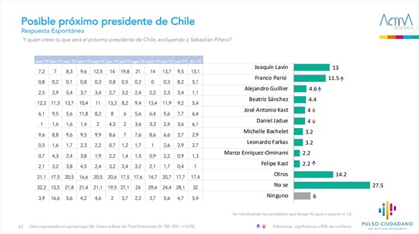 Eso sí, los encuestados respondieron que creen que el próximo Presidente de la República será Lavín (13%), seguido por Parisi (11,5%) y Alejandro Guiller (4,6%).