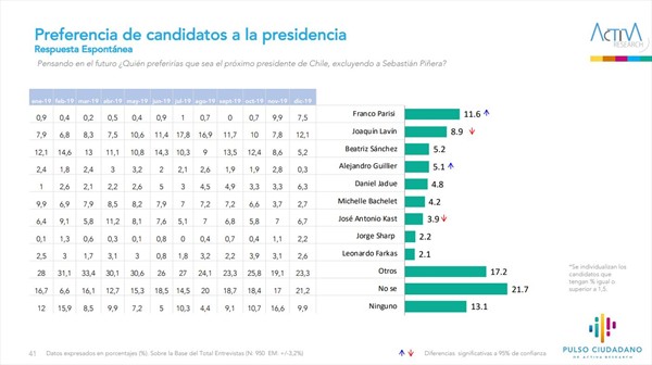 Este miércoles se dio a conocer a la encuesta Pulso Ciudadano de Activa Research, correspondiente a la primera quincena de enero, donde en la preferencia de candidatos presidenciales, Franco Parisi desplazó a Joaquín Lavín.