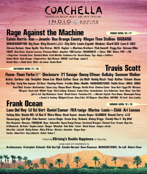 Además de los intérpretes de «Bulls On Parade», también serán parte del festival los coreanos de BIGBANG, Frank Ocean, Travis Scott, Flume, Calvin Harris y Hot Chip, entre otros.