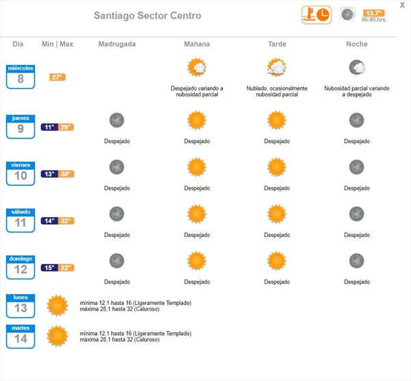 Noticias ¿Seguirá nublado? Revisa el tiempo para hoy en Santiago Este fin de semana volverá el calor. ¿Lo extrañas? Por Diego Puebla Hernández | 08 Ene, 2020. 09:47 hrs Este fin de semana volverá el calor. ¿Lo extrañas? Con tan solo 13 grados y una mañana nublada comenzó este miércoles 8 de enero en Santiago, mientras que en tarde, la máxima llegará hasta los 27°C, bajo un cielo despejado variando a nubosidad parcial. Según informó la Dirección Meteorológica de Chile, para este jueves la mínima será de 11 grados, con 29 grados de tope, y ya volverá a estar despejado. Este viernes 10 de enero los termómetros marcarán 13 grados, llegando a una máxima de 30 grados. Finalmente, este fin de semana volverá a subir la temperatura unos grados, marcando el sábado una mínima de 14°C y un peak de 32°C, y el domingo 15 grados y un peak de 32 grados. Puedes revisar aquí el pronóstico del tiempo para todas las ciudades del país (haz clic). tiempo Piñera por boicot a PSU: "Los violentistas serán juzgados" Ilustrador chileno retrató a Camila Flores y el conflicto en tienda de ropa al estilo "Los Simpsons" Sigue a FUTURO.cl en Google Discover Recibe nuestros contenidos directamente en tu feed. Seguir en Google Contenido patrocinado
