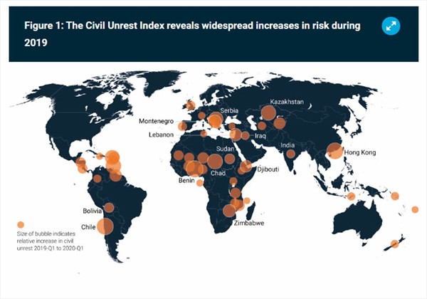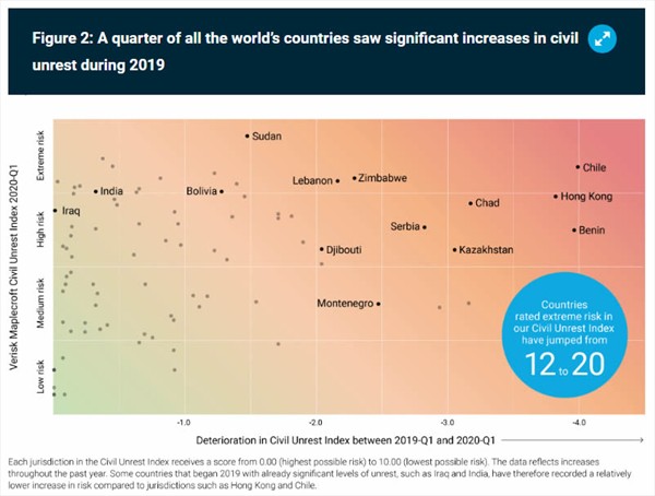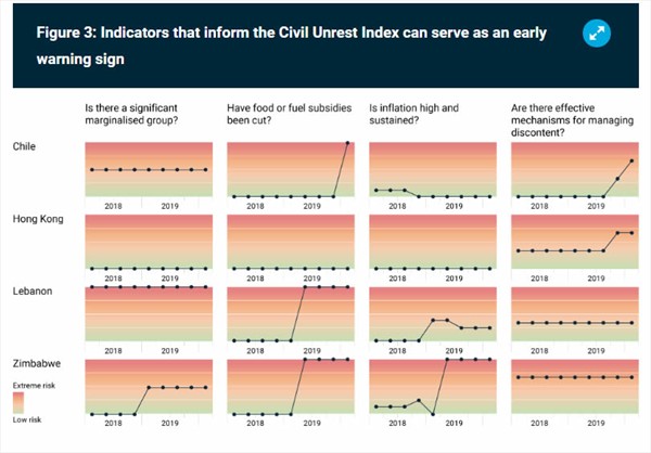 Noticias Ubicaron a Chile como uno de los países más peligrosos del mundo El estudio se enfocó en las fechas post estallido social. Por Diego Puebla Hernández | 17 Ene, 2020. 12:45 hrs El estudio se enfocó en las fechas post estallido social. La consultora británica Verisk Maplecroft difundió un estudio, en el que ubicó a Chile como uno de los países más peligrosos del mundo durante 2019, a raíz del estallido social. Según el reporte, nuestro país tuvo un aumento significativo en los disturbios civiles, poniéndose a la par de otras naciones del orbe como Hong Kong, Zimbabue, entre otros. El estudio también anticipó que la agitación social continuará en varios países durante 2020, expresando sobre Chile que habrá «una reducción menor en los disturbios en los próximos seis meses, mientras que el país permanecerá en la categoría de riegos extremo hasta al menos 2022». Chile Fiscal y ataques al Metro: "No vemos un propósito común y único, coordinado, de un solo grupo" Hernán Caputto aseguró que no le incomoda clasificar a Copa Libertadores por secretaría. Sigue a FUTURO.cl en Google Discover Recibe nuestros contenidos directamente en tu feed. Seguir en Google Contenido patrocinado