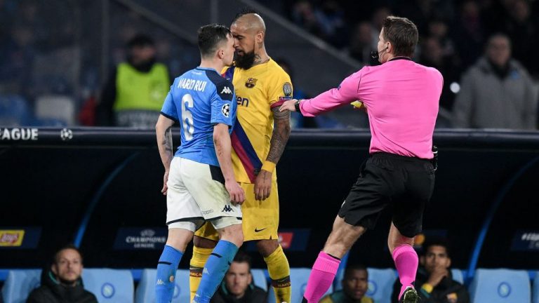 Una dura visita tuvo el FC Barcelona al sur de Italia para medirse ante el Napoli por el partido de ida de los 8vos de final de la UEFA Champions League y prueba de ello fue Arturo Vidal. Los “catalanes” consiguieron un forzado empate 1-1, resultado que le permite mirar con más tranquilidad la revancha en España.
