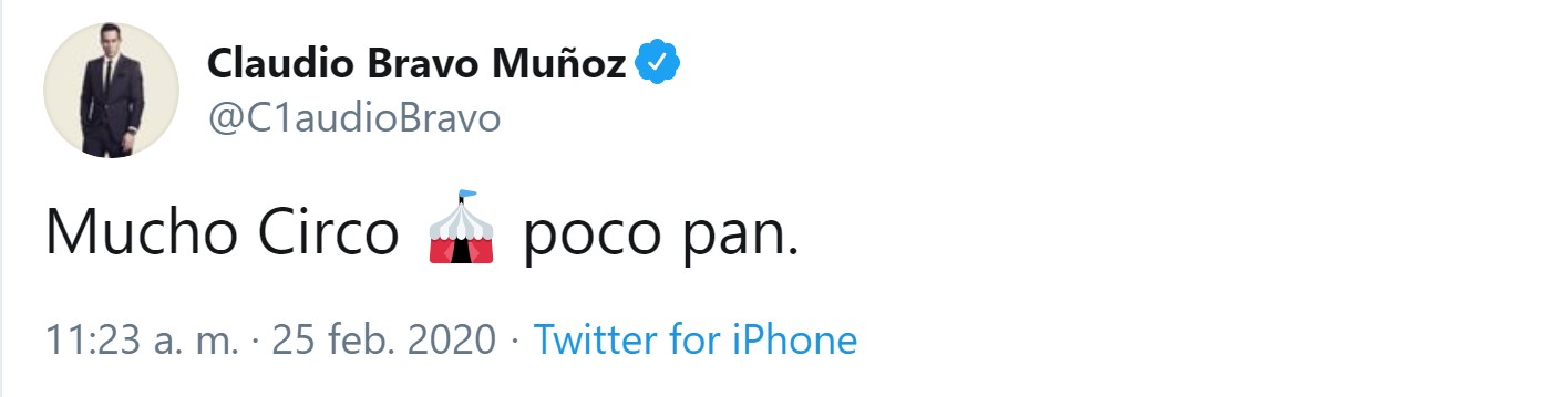 En ello y concentrados pensado en el duelo ante los “merengues”, el portero entró a su cuenta de Twitter para dejar un misterioso mensaje: “Mucho circo, poco pan“, palabras que acompañó con un emoji de una carpa de circo.