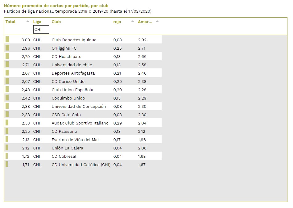 Según los datos recogidos por la entidad, durante la temporada 2019-20 (hasta el 17 de febrero) y en 92 ligas distintas, Deportes Iquique es que cuadro que tiene peores números a la hora de recibir tarjetas amarillas y rojas. Los “dragones” reciben 2,92 tarjetas amarillas por partido y un 0,08 rojas. Dichos números son lejanos a los de Montevideo Wanderers, quien lidera la tabla con 3,73 tarjetas amarillas y 0,32 tarjetas rojas, por encuentro.