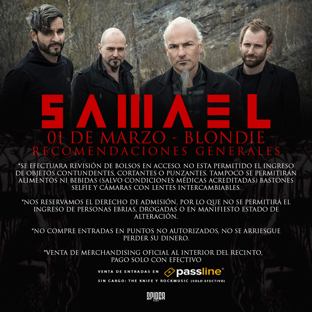 Noticias Horarios y recomendaciones para Samael en Chile Este domingo 1 de marzo se presenta la banda suiza por primera vez en el país. Por Jorge Lagas | 27 Feb, 2020. 15:10 hrs Faltan pocos días para la llegada de Samael a Chile, por primera vez en concierto este domingo 1 de marzo en el Club Blondie tocando completo su clásico disco “Ceremony of opposites” por sus 25 años. Tenemos los horarios para ese día. A saber: Revisa también las recomendaciones de seguridad: Últimas entradas: Passline.cl, sin cargo en tiendas The Knife (Eurocentro) y Rockmusic (Portal Lyon). Samael Jazz Sabbath anuncia su primer disco con documental ficticio Deep Purple lanzará su nuevo disco "Whoosh!" en junio Sigue a FUTURO.cl en Google Discover Recibe nuestros contenidos directamente en tu feed. Seguir en Google Contenido patrocinado
